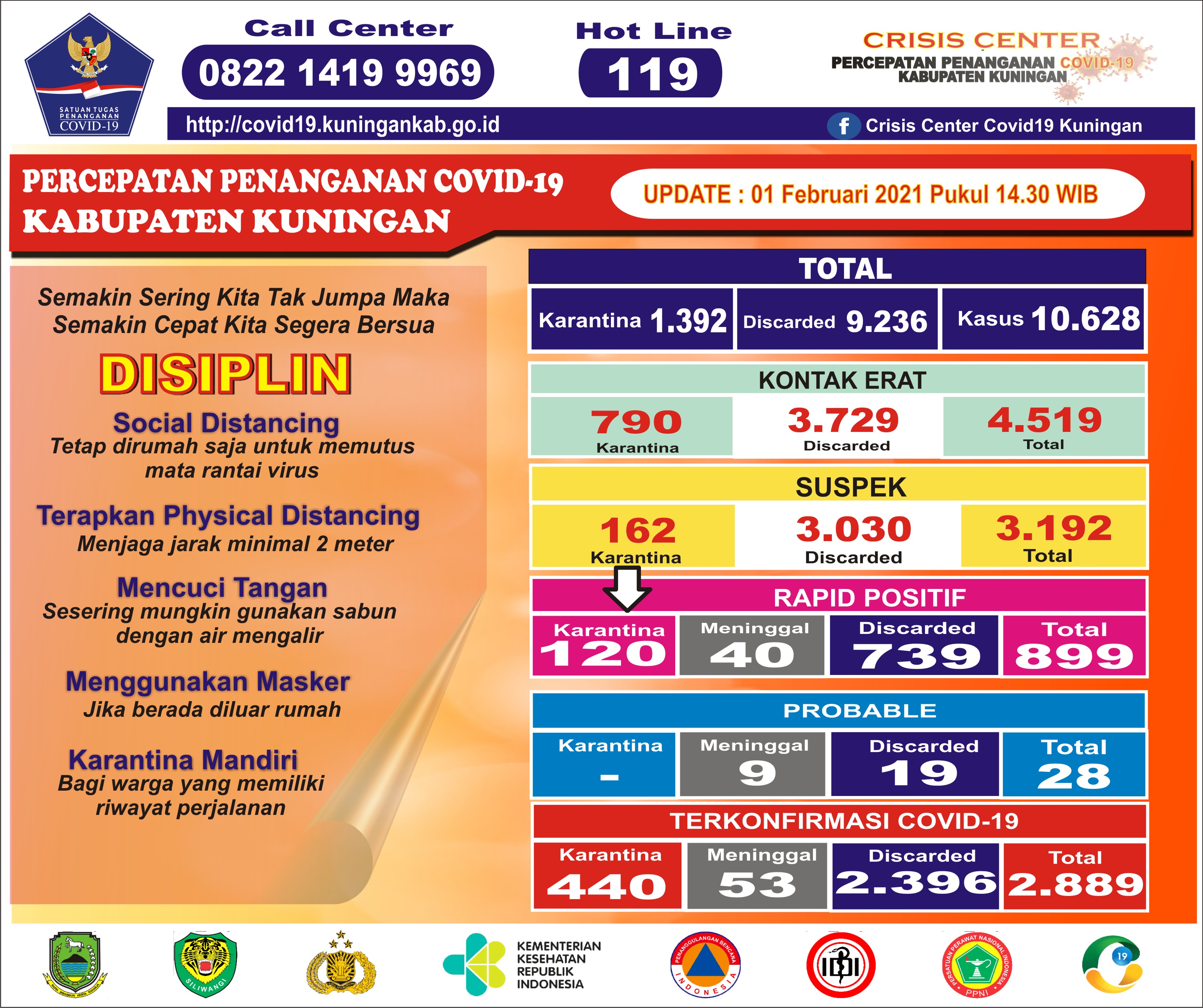 Angka Kejadian di Kabupaten Kuningan Tanggal UpdateSenin, 1 Februari 2021 - 15:08 KONTAK ERAT Kontak Erat - Total4.519 Kontak Erat - Discarded3.729 Kontak Erat - Karantina790 Rincian Jenis Kelamin Laki-laki2144 Jenis Kelamin Perempuan2375 WNI4519 Usia 0 - 11 Bulan20 Usia 1 - 5 Tahun120 Usia 6 - 19 Tahun886 Usia 20 - 29 Tahun868 Usia 30 - 39 Tahun754 Usia 40 - 49 Tahun835 Usia 50 - 59 Tahun687 Usia 60 - 69 Tahun235 Usia 70 -79 Tahun81 Usia > 80 Tahun17 SUSPEK Kasus Suspek - Total3192 Kasus Suspek - Discarded3030 Kasus Suspek - Masih Karantina162 Rincian Jenis Kelamin Laki-laki1838 Jenis Kelamin Perempuan1354 WNI3191 WNA1 Usia 0 - 11 Bulan42 Usia 1 - 5 Tahun141 Usia 6 - 19 Tahun301 Usia 20 - 29 Tahun694 Usia 30 - 39 Tahun541 Usia 40 - 49 Tahun482 Usia 50 - 59 Tahun472 Usia 60 - 69 Tahun321 Usia 70 -79 Tahun135 Usia > 80 Tahun47 RAPID POSITIF Rapid Positif - Total899 Rapid Positif - Masih Karantina120 Rapid Positif - Sembuh739 Rapid Positif - Meninggal40 PROBABLE Probable - Total28 Probable - Discarded19 Probable - Meninggal8 Rincian Jenis Kelamin Laki-laki11 Jenis Kelamin Perempuan17 Usia 1 - 4 Tahun2 Usia 6 - 19 Tahun1 Usia 20 - 29 Tahun3 Usia 30 - 39 Tahun2 Usia 40 - 49 Tahun7 Usia 50 - 59 Tahun5 Usia 60 - 69 Tahun4 Usia 70 -79 Tahun2 Usia > 80 Tahun2 KASUS KONFIRMASI Kasus Konfirmasi - Total2.889 Kasus Konfirmasi - Masih Karantina440 Kasus Konfirmasi - Discarded2.396 Kasus Konfirmasi - Meninggal53 Rincian Jenis Kelamin Laki-laki1452 Jenis Kelamin Perempuan1437 WNI2889 Usia < 5 Tahun44 Usia 6 - 19 Tahun836 Usia 20 - 29 Tahun404 Usia 30 - 39 Tahun419 Usia 40 - 49 Tahun470 Usia 50 - 59 Tahun404 Usia 60 - 69 Tahun193 Usia 70 - 79 Tahun70 Usia > 80 Tahun17 TOTAL KASUS KESELURUHAN Total Kasus Karantina1.392 Total Kasus Discarded9.236 Total Kasus Keseluruhan10.628 Gambar Release Harian
