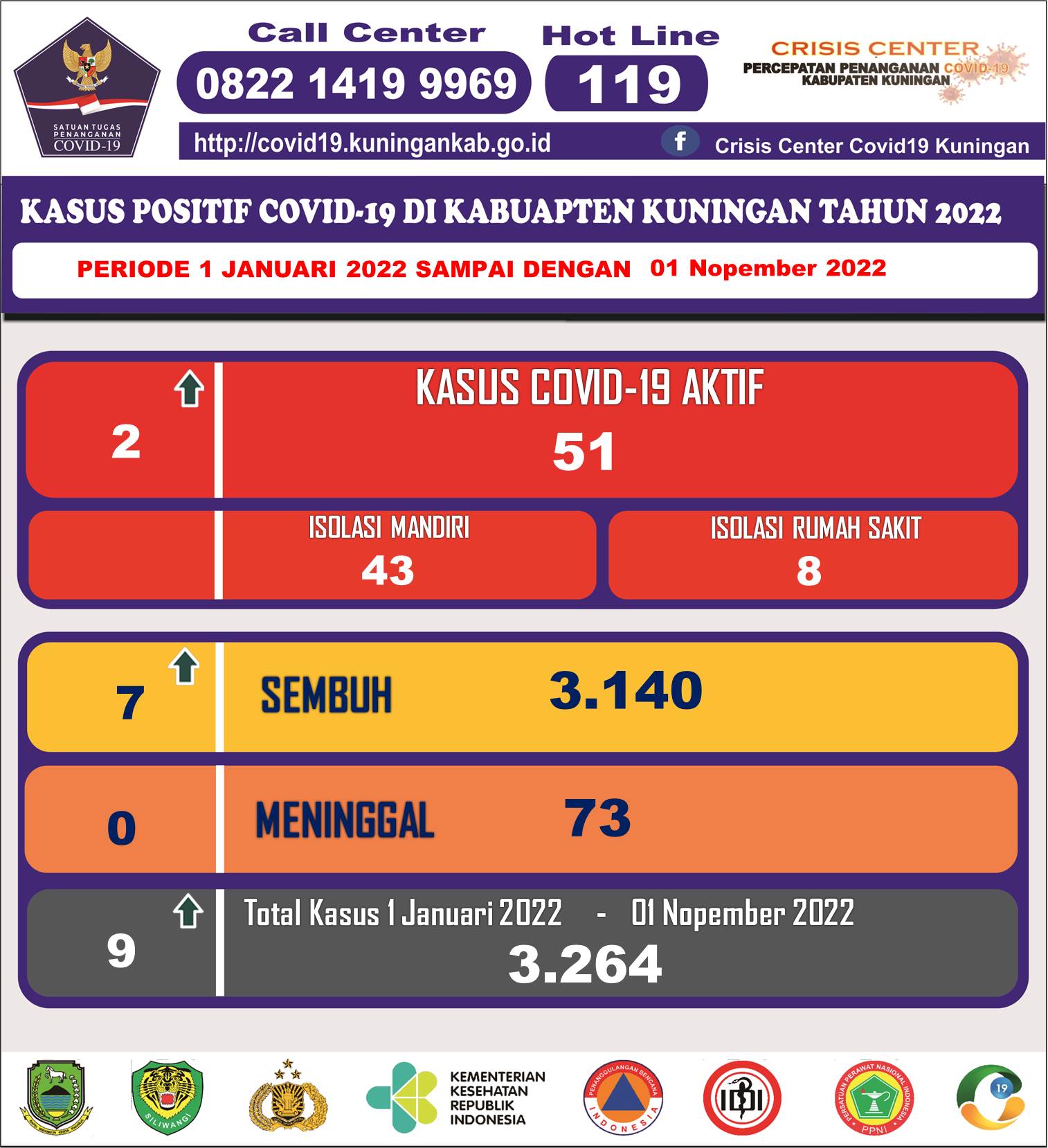 DATA JUMLAH KASUS Tanggal UpdateSelasa, 1 November 2022 - 12:55 KONTAK ERAT Kontak Erat - Total9.881 Kontak Erat - Discarded9.881 Kontak Erat - Karantina0 Rincian Jenis Kelamin Laki-laki4793 Jenis Kelamin Perempuan5088 WNI9881 WNA0 Usia 0 - 11 Bulan41 Usia 1 - 5 Tahun338 Usia 6 - 19 Tahun1812 Usia 20 - 29 Tahun1776 Usia 30 - 39 Tahun1612 Usia 40 - 49 Tahun2080 Usia 50 - 59 Tahun1418 Usia 60 - 69 Tahun595 Usia 70 -79 Tahun199 Usia > 80 Tahun49 SUSPEK Kasus Suspek - Total3748 Kasus Suspek - Discarded3748 Kasus Suspek - Masih Karantina0 Rincian Jenis Kelamin Laki-laki2047 Jenis Kelamin Perempuan1701 WNI3747 WNA1 Usia 0 - 11 Bulan159 Usia 1 - 5 Tahun148 Usia 6 - 19 Tahun319 Usia 20 - 29 Tahun762 Usia 30 - 39 Tahun601 Usia 40 - 49 Tahun553 Usia 50 - 59 Tahun579 Usia 60 - 69 Tahun398 Usia 70 -79 Tahun163 Usia > 80 Tahun51 RAPID POSITIF Rapid Positif - Total1.001 Rapid Positif - Masih Karantina0 Rapid Positif - Sembuh955 Rapid Positif - Meninggal46 Rapid Positif - Jadi Konfirmasi Positif0 PROBABLE Probable - Total159 Probable - Masih Karantina0 Probable - Discarded141 Probable - Meninggal18 Rincian Jenis Kelamin Laki-laki70 Jenis Kelamin Perempuan89 WNI159 WNA0 Usia 0 - 11 Bulan2 Usia 1 - 4 Tahun2 Usia 5 Tahun0 Usia 6 - 19 Tahun4 Usia 20 - 29 Tahun7 Usia 30 - 39 Tahun23 Usia 40 - 49 Tahun30 Usia 50 - 59 Tahun38 Usia 60 - 69 Tahun31 Usia 70 -79 Tahun18 Usia > 80 Tahun4 KASUS KONFIRMASI Kasus Konfirmasi - Total16.992 Kasus Konfirmasi - Masih Karantina51 Kasus Konfirmasi - Discarded16.162 Kasus Konfirmasi - Meninggal779 Rincian Jenis Kelamin Laki-laki7404 Jenis Kelamin Perempuan9588 WNI16992 WNA0 Usia < 5 Tahun504 Usia 6 - 19 Tahun2682 Usia 20 - 29 Tahun2517 Usia 30 - 39 Tahun2662 Usia 40 - 49 Tahun2724 Usia 50 - 59 Tahun2967 Usia 60 - 69 Tahun1904 Usia 70 - 79 Tahun840 Usia > 80 Tahun199 Gambar Release Harian