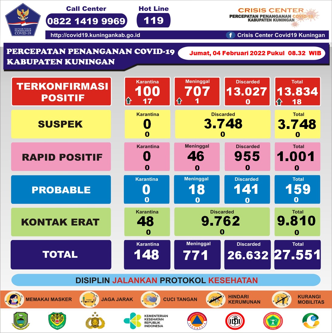Data Covid-19 Kab. Kuningan update tgl 4-2-2022 Tanggal UpdateJumat, 4 Februari 2022 - 08:32 KONTAK ERAT Kontak Erat - Total9.810 Kontak Erat - Discarded9.762 Kontak Erat - Karantina48 Rincian Jenis Kelamin Laki-laki4764 Jenis Kelamin Perempuan5046 WNI9810 Usia 0 - 11 Bulan41 Usia 1 - 5 Tahun338 Usia 6 - 19 Tahun1741 Usia 20 - 29 Tahun1776 Usia 30 - 39 Tahun1612 Usia 40 - 49 Tahun2080 Usia 50 - 59 Tahun1418 Usia 60 - 69 Tahun595 Usia 70 -79 Tahun199 Usia > 80 Tahun49 SUSPEK Kasus Suspek - Total3748 Kasus Suspek - Discarded3748 Kasus Suspek - Masih Karantina0 Rincian Jenis Kelamin Laki-laki2047 Jenis Kelamin Perempuan1701 WNI3747 WNA1 Usia 0 - 11 Bulan159 Usia 1 - 5 Tahun148 Usia 6 - 19 Tahun319 Usia 20 - 29 Tahun762 Usia 30 - 39 Tahun601 Usia 40 - 49 Tahun553 Usia 50 - 59 Tahun579 Usia 60 - 69 Tahun398 Usia 70 -79 Tahun163 Usia > 80 Tahun51 RAPID POSITIF Rapid Positif - Total1.001 Rapid Positif - Masih Karantina0 Rapid Positif - Sembuh955 Rapid Positif - Meninggal46 PROBABLE Probable - Total159 Probable - Masih Karantina0 Probable - Discarded141 Probable - Meninggal18 Rincian Jenis Kelamin Laki-laki70 Jenis Kelamin Perempuan89 Usia 0 - 11 Bulan2 Usia 1 - 4 Tahun2 Usia 5 Tahun0 Usia 6 - 19 Tahun4 Usia 20 - 29 Tahun7 Usia 30 - 39 Tahun23 Usia 40 - 49 Tahun30 Usia 50 - 59 Tahun38 Usia 60 - 69 Tahun31 Usia 70 -79 Tahun18 Usia > 80 Tahun4 KASUS KONFIRMASI Kasus Konfirmasi - Total13.834 Kasus Konfirmasi - Masih Karantina100 Kasus Konfirmasi - Discarded13.027 Kasus Konfirmasi - Meninggal707 Rincian Jenis Kelamin Laki-laki6084 Jenis Kelamin Perempuan7750 WNI13834 Usia < 5 Tahun367 Usia 6 - 19 Tahun2120 Usia 20 - 29 Tahun1932 Usia 30 - 39 Tahun2144 Usia 40 - 49 Tahun2349 Usia 50 - 59 Tahun2572 Usia 60 - 69 Tahun1585 Usia 70 - 79 Tahun647 Usia > 80 Tahun128 TOTAL KASUS KESELURUHAN Total Kasus Karantina148 Total Kasus Discarded26.632 Total Kasus Keseluruhan27.551 Total Kasus Meninggal771 Gambar Release Harian