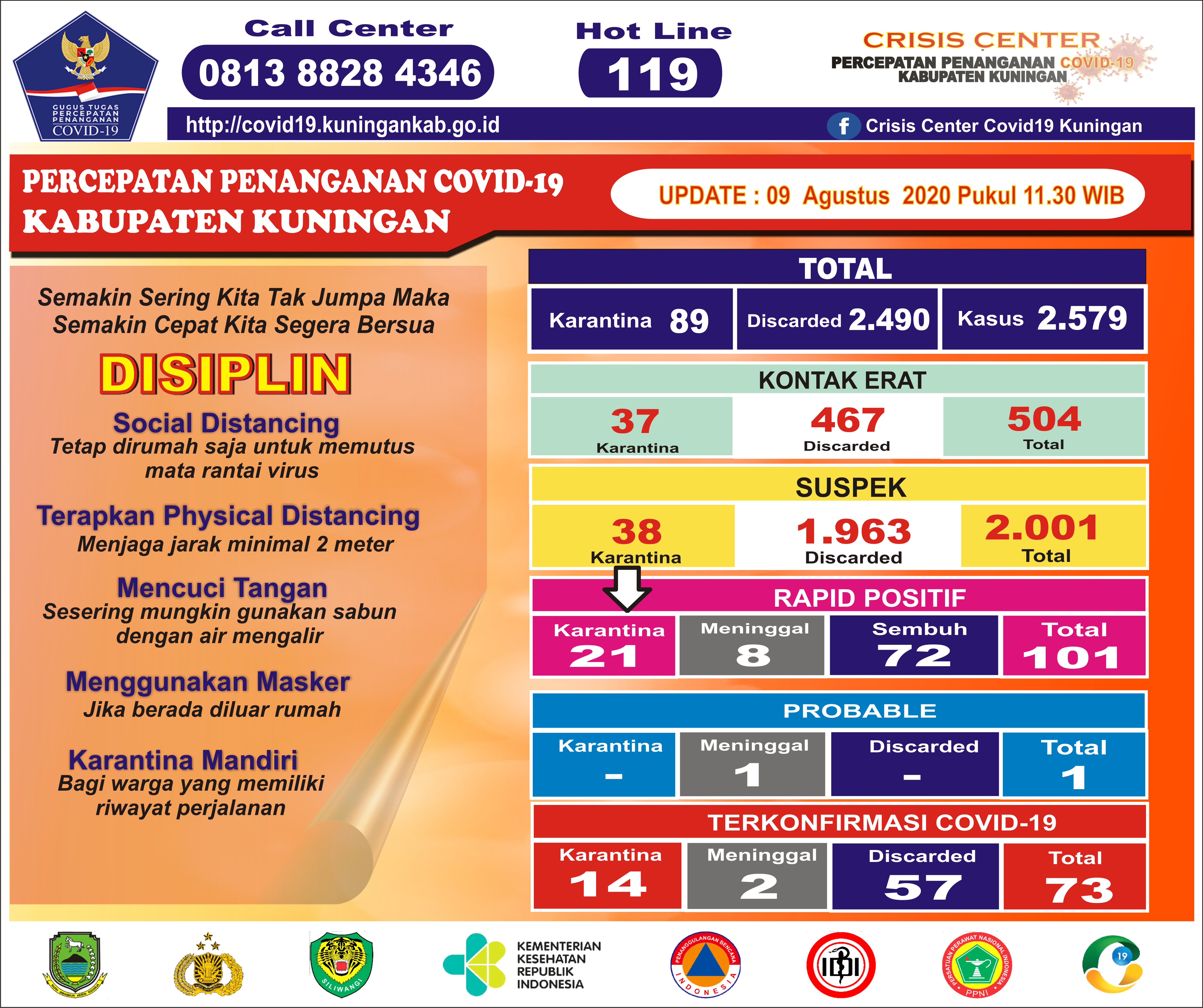 INFOGRAFIS KASUS 9 AGUSTUS 2020 Tanggal UpdateMinggu, 9 Agustus 2020 - 11:30 KONTAK ERAT Kontak Erat - Total504 Kontak Erat - Discarded467 Kontak Erat - Karantina37 Rincian Jenis Kelamin Laki-laki254 Jenis Kelamin Perempuan250 WNI504 WNA0 Usia 0 - 11 Bulan2 Usia 1 - 5 Tahun15 Usia 6 - 19 Tahun67 Usia 20 - 29 Tahun85 Usia 30 - 39 Tahun98 Usia 40 - 49 Tahun122 Usia 50 - 59 Tahun82 Usia 60 - 69 Tahun20 Usia 70 -79 Tahun13 Usia > 80 Tahun0 SUSPEK Kasus Suspek - Total2001 Kasus Suspek - Discarded1963 Kasus Suspek - Masih Karantina38 Rincian Jenis Kelamin Laki-laki1303 Jenis Kelamin Perempuan698 RAPID POSITIF Rapid Positif - Total101 Rapid Positif - Masih Karantina21 Rapid Positif - Sembuh72 Rapid Positif - Meninggal8 Rapid Positif - Jadi Konfirmasi Positif1 PROBABLE Probable - Total1 Probable - Masih Karantina1 Probable - Discarded0 Probable - Meninggal0 Rincian Jenis Kelamin Laki-laki0 Jenis Kelamin Perempuan1 KASUS KONFIRMASI Kasus Konfirmasi - Total73 Kasus Konfirmasi - Masih Karantina14 Kasus Konfirmasi - Discarded57 Kasus Konfirmasi - Meninggal2 Rincian Jenis Kelamin Laki-laki47 Jenis Kelamin Perempuan26 WNI73 WNA0 Usia < 5 Tahun0 Usia 6 - 19 Tahun6 Usia 20 - 29 Tahun12 Usia 30 - 39 Tahun6 Usia 40 - 49 Tahun31 Usia 50 - 59 Tahun15 Usia 60 - 69 Tahun0 Usia 70 - 79 Tahun3 Usia > 80 Tahun0 TOTAL KASUS KESELURUHAN Total Kasus Karantina89 Total Kasus Discarded2.490 Total Kasus Keseluruhan2.579 Gambar Release Harian
