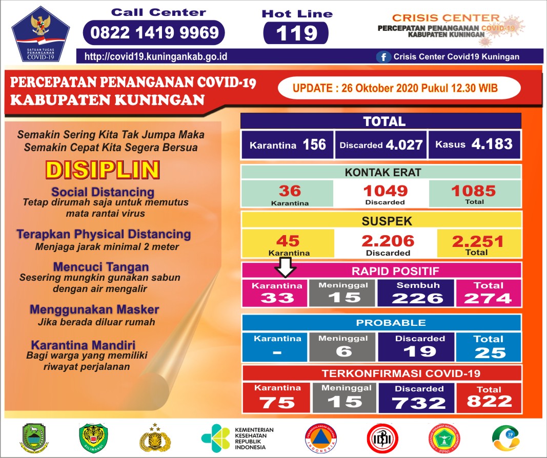 Angka Kejadian di Kabupaten Kuningan Tanggal UpdateSenin, 26 Oktober 2020 - 12:37 KONTAK ERAT Kontak Erat - Total1.085 Kontak Erat - Discarded1.049 Kontak Erat - Karantina36 Rincian Jenis Kelamin Laki-laki593 Jenis Kelamin Perempuan492 WNI1085 Usia 0 - 11 Bulan7 Usia 1 - 5 Tahun29 Usia 6 - 19 Tahun379 Usia 20 - 29 Tahun160 Usia 30 - 39 Tahun133 Usia 40 - 49 Tahun162 Usia 50 - 59 Tahun115 Usia 60 - 69 Tahun34 Usia 70 -79 Tahun28 Usia > 80 Tahun1 SUSPEK Kasus Suspek - Total2251 Kasus Suspek - Discarded2206 Kasus Suspek - Masih Karantina45 Rincian Jenis Kelamin Laki-laki1422 Jenis Kelamin Perempuan829 WNI2250 WNA1 Usia 0 - 11 Bulan21 Usia 1 - 5 Tahun115 Usia 6 - 19 Tahun249 Usia 20 - 29 Tahun576 Usia 30 - 39 Tahun418 Usia 40 - 49 Tahun326 Usia 50 - 59 Tahun278 Usia 60 - 69 Tahun171 Usia 70 -79 Tahun68 Usia > 80 Tahun29 RAPID POSITIF Rapid Positif - Total274 Rapid Positif - Masih Karantina33 Rapid Positif - Sembuh226 Rapid Positif - Meninggal15 PROBABLE Probable - Total25 Probable - Masih Karantina1 Probable - Discarded19 Probable - Meninggal6 Rincian Jenis Kelamin Laki-laki8 Jenis Kelamin Perempuan17 Usia 1 - 4 Tahun1 Usia 6 - 19 Tahun1 Usia 20 - 29 Tahun3 Usia 30 - 39 Tahun2 Usia 40 - 49 Tahun7 Usia 50 - 59 Tahun3 Usia 60 - 69 Tahun4 Usia 70 -79 Tahun2 Usia > 80 Tahun2 KASUS KONFIRMASI Kasus Konfirmasi - Total822 Kasus Konfirmasi - Masih Karantina75 Kasus Konfirmasi - Discarded732 Kasus Konfirmasi - Meninggal15 Rincian Jenis Kelamin Laki-laki628 Jenis Kelamin Perempuan194 WNI822 Usia < 5 Tahun8 Usia 6 - 19 Tahun447 Usia 20 - 29 Tahun81 Usia 30 - 39 Tahun93 Usia 40 - 49 Tahun97 Usia 50 - 59 Tahun51 Usia 60 - 69 Tahun20 Usia 70 - 79 Tahun14 Usia > 80 Tahun1 TOTAL KASUS KESELURUHAN Total Kasus Karantina4.183 Total Kasus Discarded4.027 Total Kasus Keseluruhan4.183 Gambar Release Harian